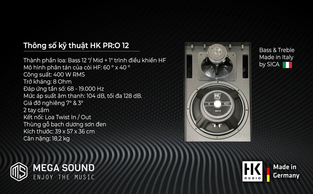 Loa đáp ứng tần số âm thanh rộng từ 68Hz - 19kHz, thể hiện chi tiết nhiều dòng nhạc khác nhau như : bolero trữ tình, nhạc Remix, DJ sôi động. Nhờ có củ loa bass cao cấp từ SICA sản xuất tại Italy là một trong những nhà sản xuất củ loa hàng đầu thế giới mà HK PR:O 12 có thể tái hiện được những âm thanh vô cùng chi tiết và âm trầm sâu lắng.